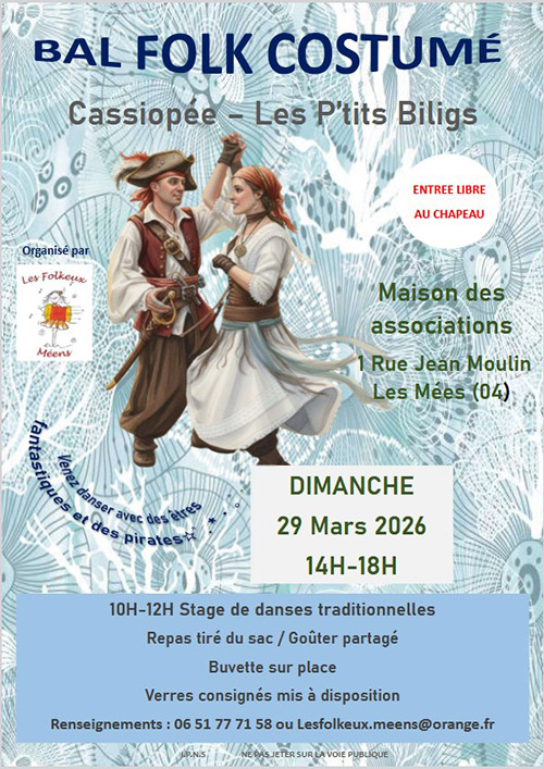 | 29 mars | Les Mées (04) | ![]() Les FOLKEUX MEENS organisent une journée TRAD Dimanche 29 Mars 2026 à la Maison des associations des Mées (04). Voici le programme :