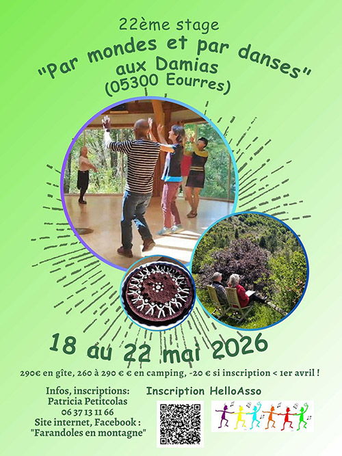 | 18 au 22 mai | Eourres (05) | ![]() Aux Damias (05300 Eourres) du 18 au 22 mai (4 jours) : remise de 20 € pour toute inscription avant le 1er avril ! Inscription possible en ligne ou ici. |